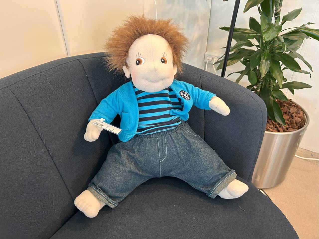 Dukken er lavet i en blød polyester fleece, og er fyldt med polyester fibre. Bunden er fyldt med granulat, som gør, at dukken har en god tyngde, og dermed sidder bedre.