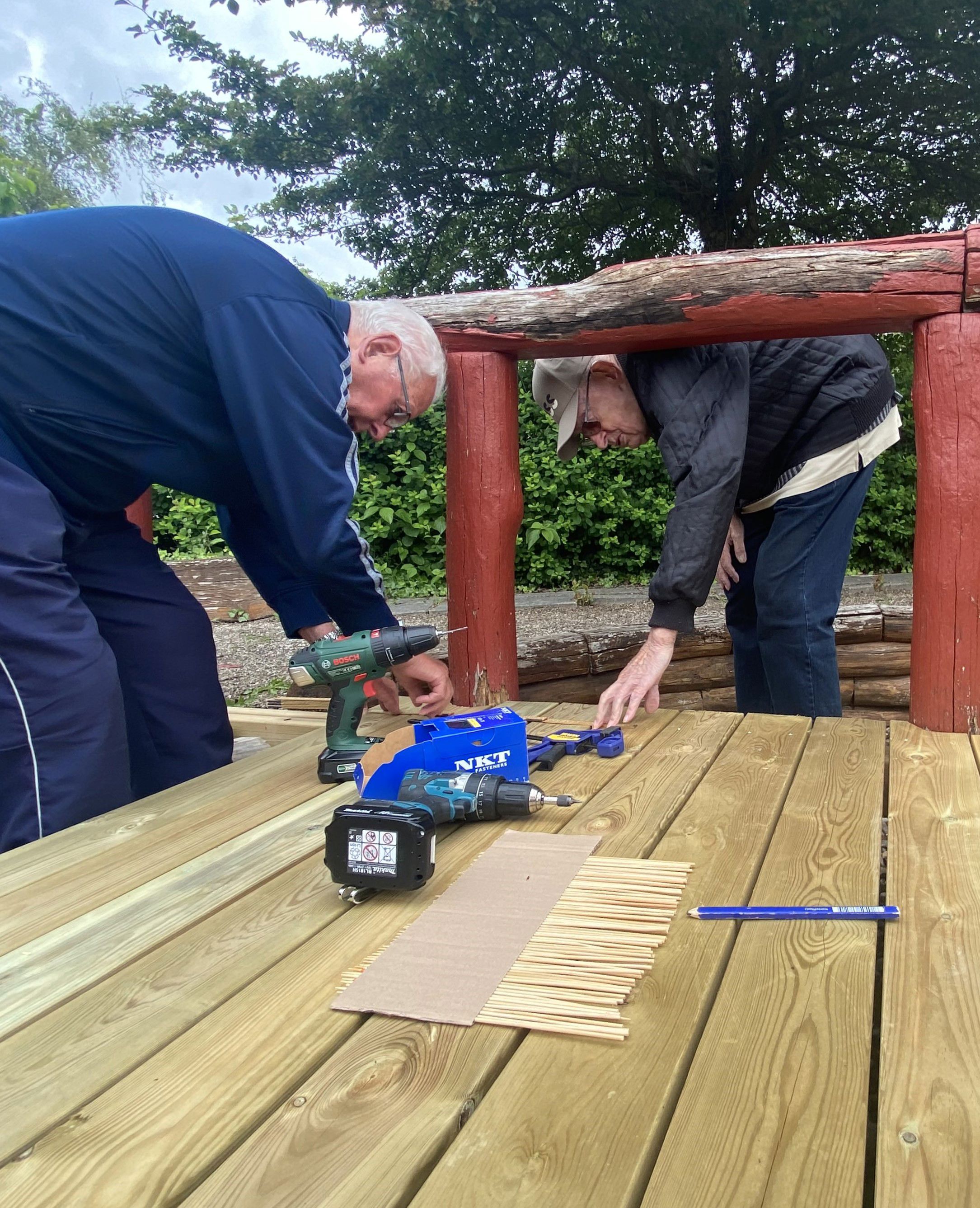 For øjeblikket renoverer de ved fælles hjælp broen i Rosenvængets sansehave. ”Der er meget god træning i sådan et projekt”, forklarer social- og sundhedsassistent Gitte Albrechtsen og træningsmedarbejder Frank Lindgaard, ”- både kognitivt med planlægning, opmåling og udregning, fysisk med håndtering af brædder, værktøj og forskellige arbejdsstillinger samt en masse socialt i samarbejdet”. De fire mænd i gruppen har selv haft en stor andel i at lede og fordele arbejdet mellem sig. Én har dårligt syn men kan godt stå for transporten af brædderne fra ”savværket” (et havebord i en pavillon) og ned til sansehaven. Brædderne balanceres på rollatoren. En anden er god til at udregne og opmåle, og de hjælpes med at få savet, skruet osv.