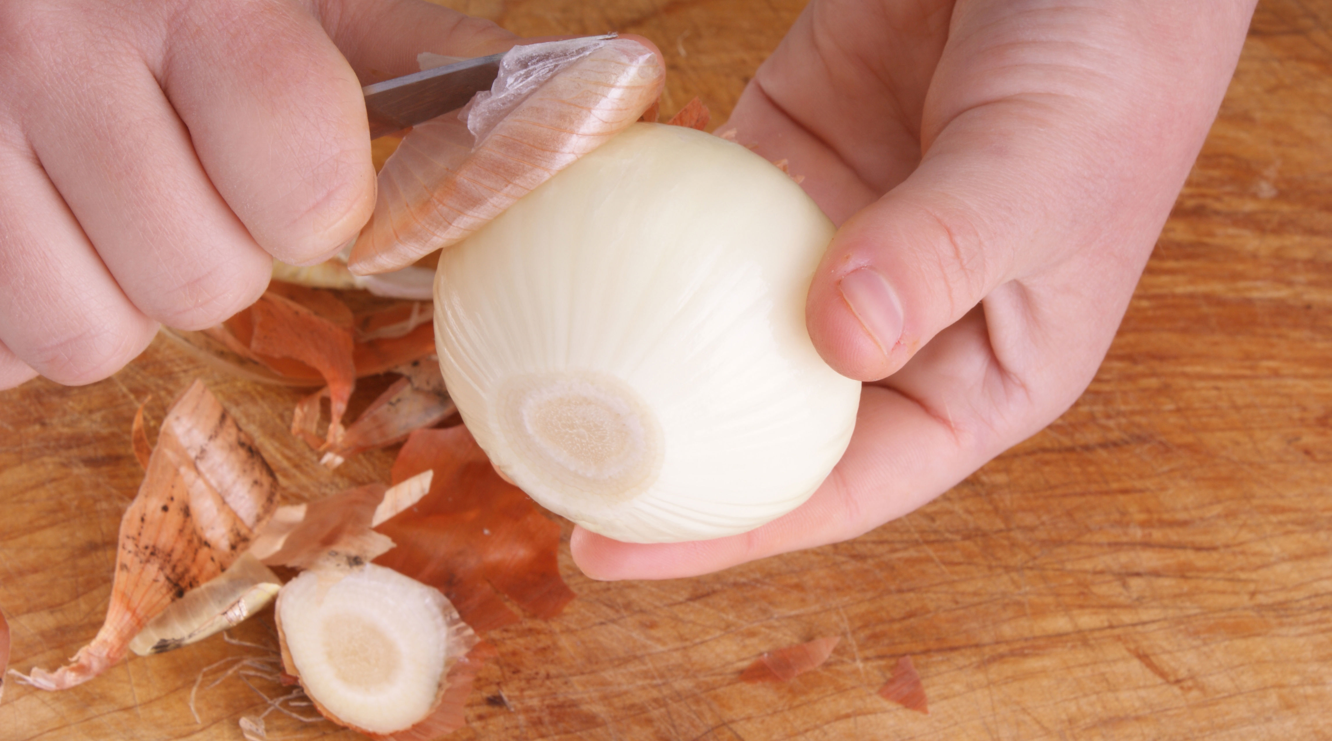 Skallerne kan også overhældes med kogende vand og sødes med lidt honning til en varmende løg-te.