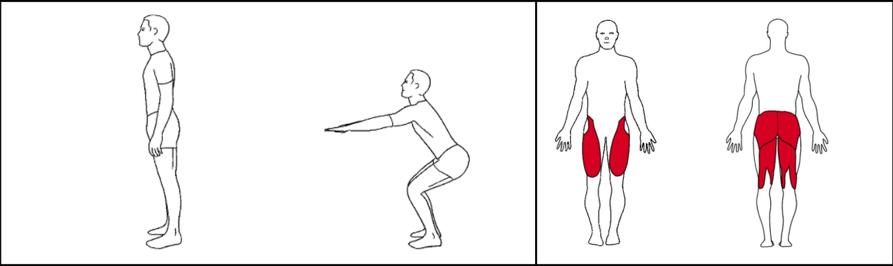 Stå med hoftebreddes afstand mellem benene. Bøj ned til ca. 90 grader i knæene og skyd rumpen ud som om du skal sætte dig på en stol. Før samtidig armene fremad. Stræk dig roligt op til stående igen, samtidig med at du fører armene ind til kroppen igen.