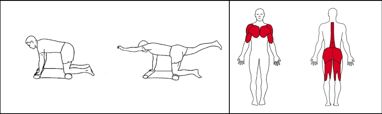 Placerer dine knæ på en måtte eller et håndklæde. Stå på alle fire således at armene og knæene er placeret på måtten/håndklædet. Spænd op i maven og ryggen og løft og stræk skiftevis modsat arm og ben. Man kan evt. rulle måtten/håndklædet sammen så øvelsen bliver mere udfordrende.
