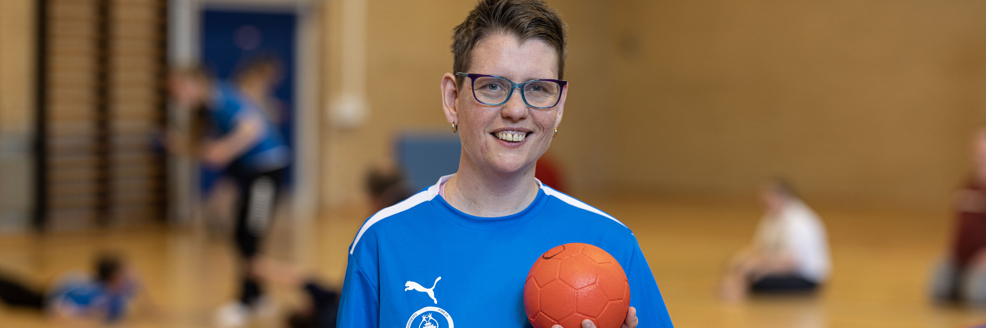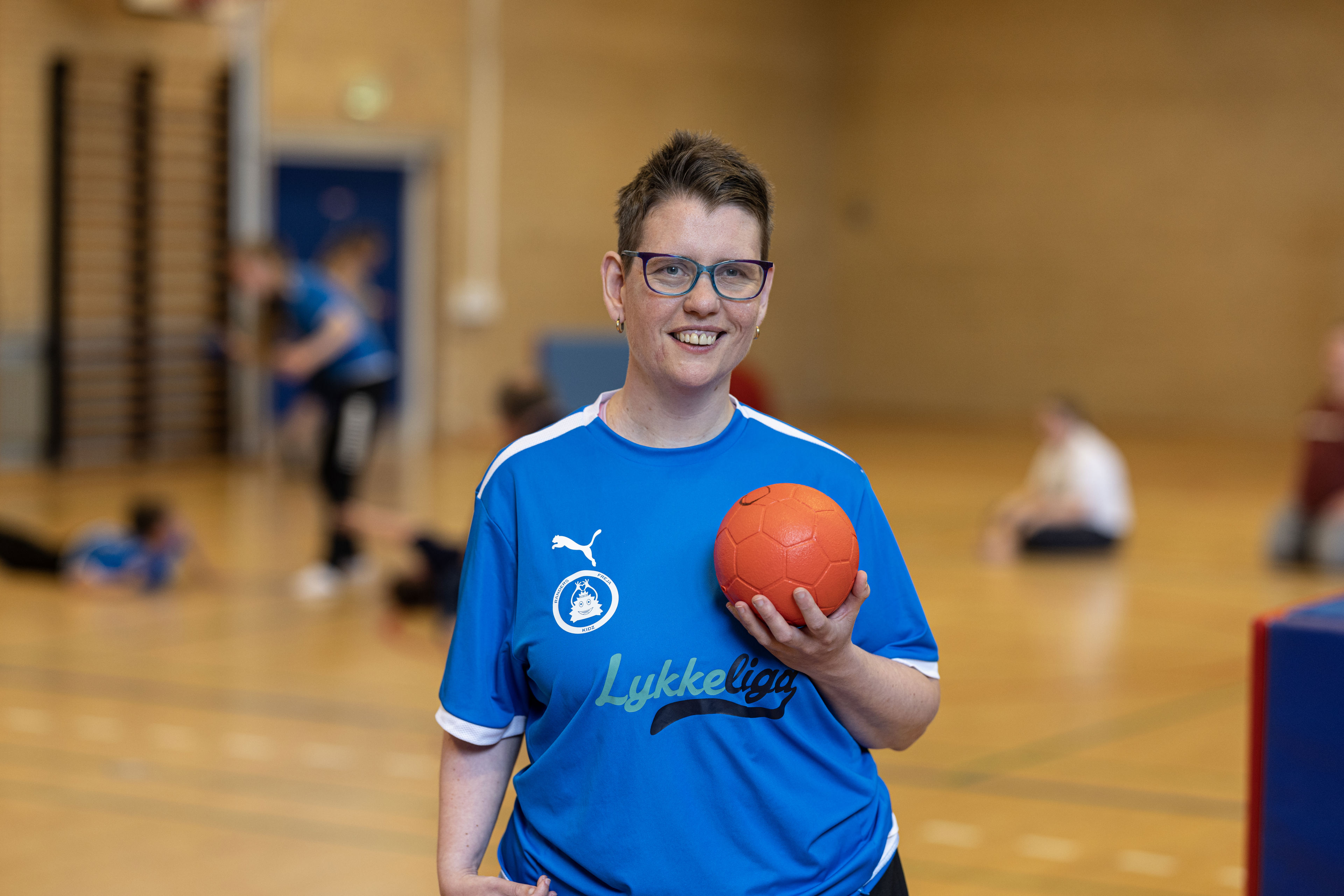38-årige Lotte Kongsbak smiler stort, mens hun sender bolden afsted mod målet. Hun er født med cerebral parese, hvilket betyder, at hun har både kognitive og fysiske udfordringer. Hun bor til dagligt i Bofællesskabet Spentrup, men hver søndag står hun klar i Arena Randers, hvor hun træner håndbold i Randers Freja/Lykkeliga.