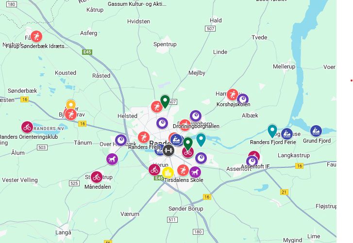 Find idrætsfaciliteter, klubhuse, parker mm. på kortet nedenfor. Hvis du har rettelser til kortet over faciliteter i Randers Kommune, er du velkommen til at skrive til fritid.kultur@randers.dk.