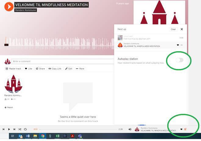 Hvis du ikke slår autoplay fra, når du går ind i Soundcloud, begynder afspilning af en ny lydfil automatisk, når den mindfulnessfil, du lytter til, er færdig. Du slår autoplay fra ved at klikke på knappen nederst i højre hjørne i Soundcloud og derefter fjerne markeringen i "Autoplay station".