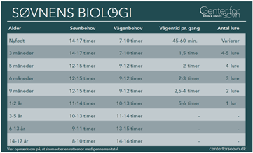 Det er opstillet i kolonnerne Alder, Søvnbehov, Vågenbehov, Vågentid pr. gang og Antal lure.