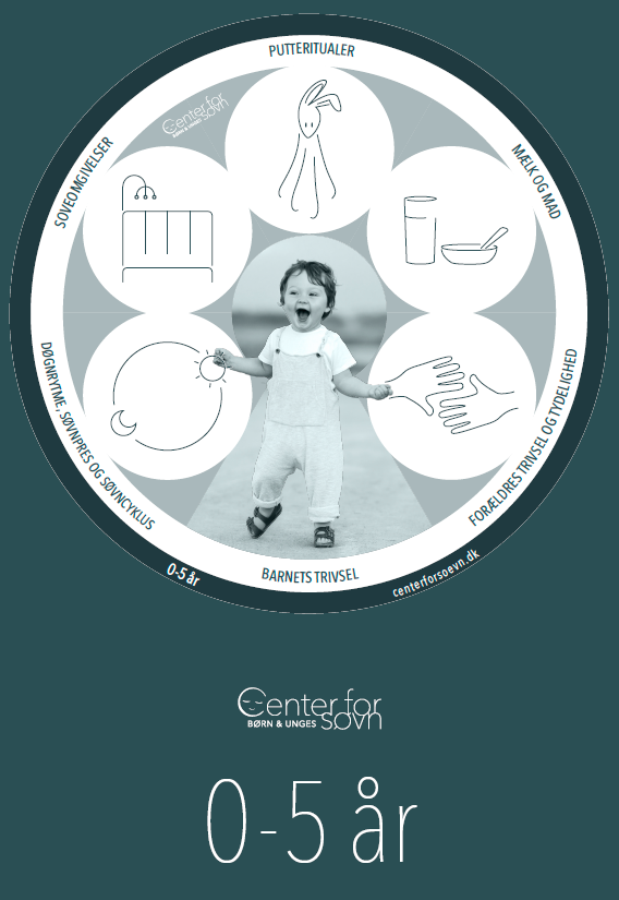 Viser et barn der er omgivet af billeder som symboliserer 5 vigtige punkter for barnets trivsel. Det er døgnrytme, søvnpres og søvncyklus, soveomgivelser, putteritualer, mælk og mad samt forældres trivsel og tydelighed.