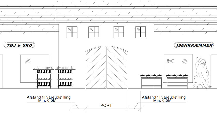 - Vareudstilling skal placeres langs butikkens facade. Hvis det ikke kan lade sig gøre, kan der søges dispensation.