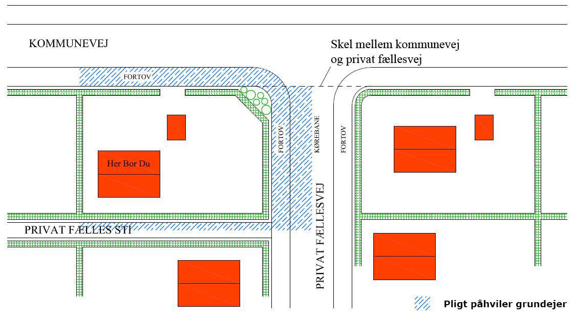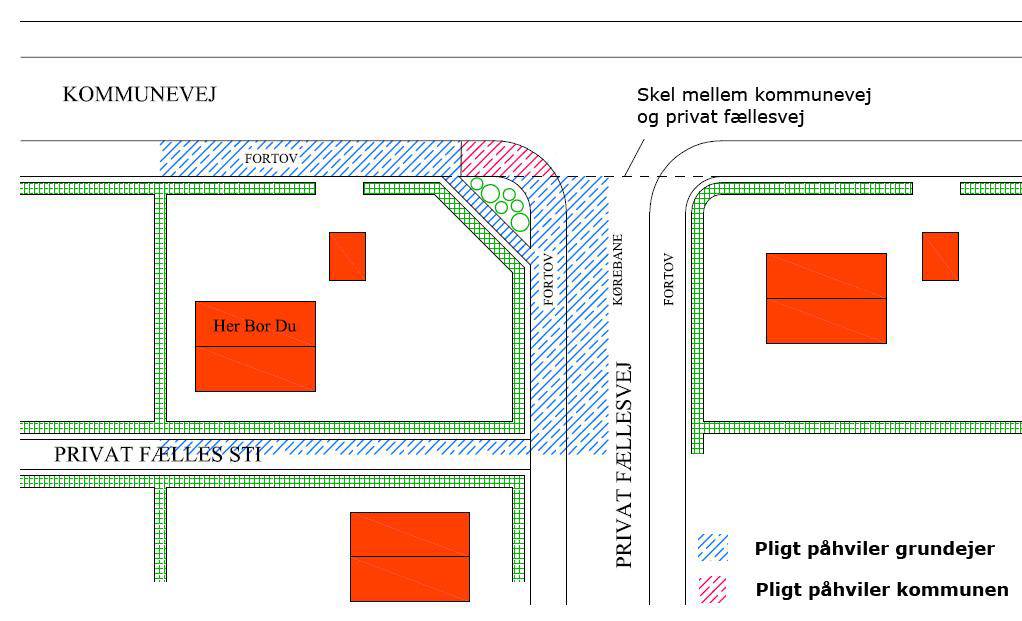 Ved en hjørnegrund med skel mellem kommunevej og privat fællesvej har grundejeren pligt til vintertjeneste for den del af det kommunale fortov, der ligger nærmest ejendommen.