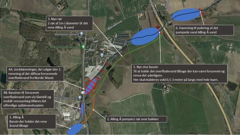 - Alling Å bliver stoppet med en dæmning syd for Nordic Waste. Her har vi skabt et ca. 72.000 kubikmeter stort ”bassin” hvor det rene å-vand løber hen.