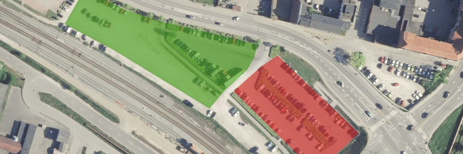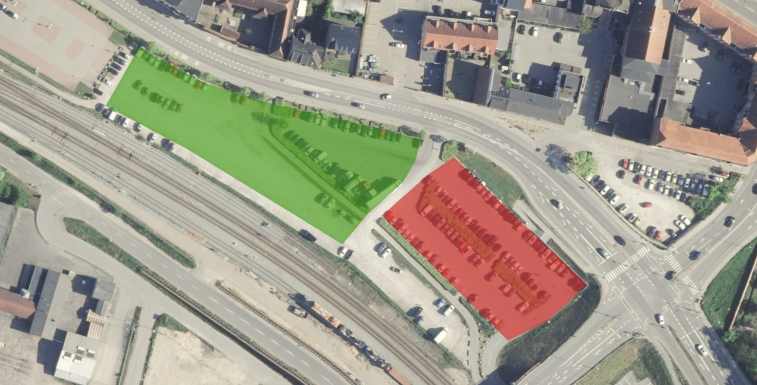 Alle biler, der i øjeblikket holder parkeret på den del af parkeringspladsen, der er markeret med rødt på ovenstående billede, skal flyttes til den ’grønne’ del af parkeringspladsen lige ved siden af inden mandag den 19. maj. Det er nødvendigt for at færdiggøre det sidste stykke arbejde.