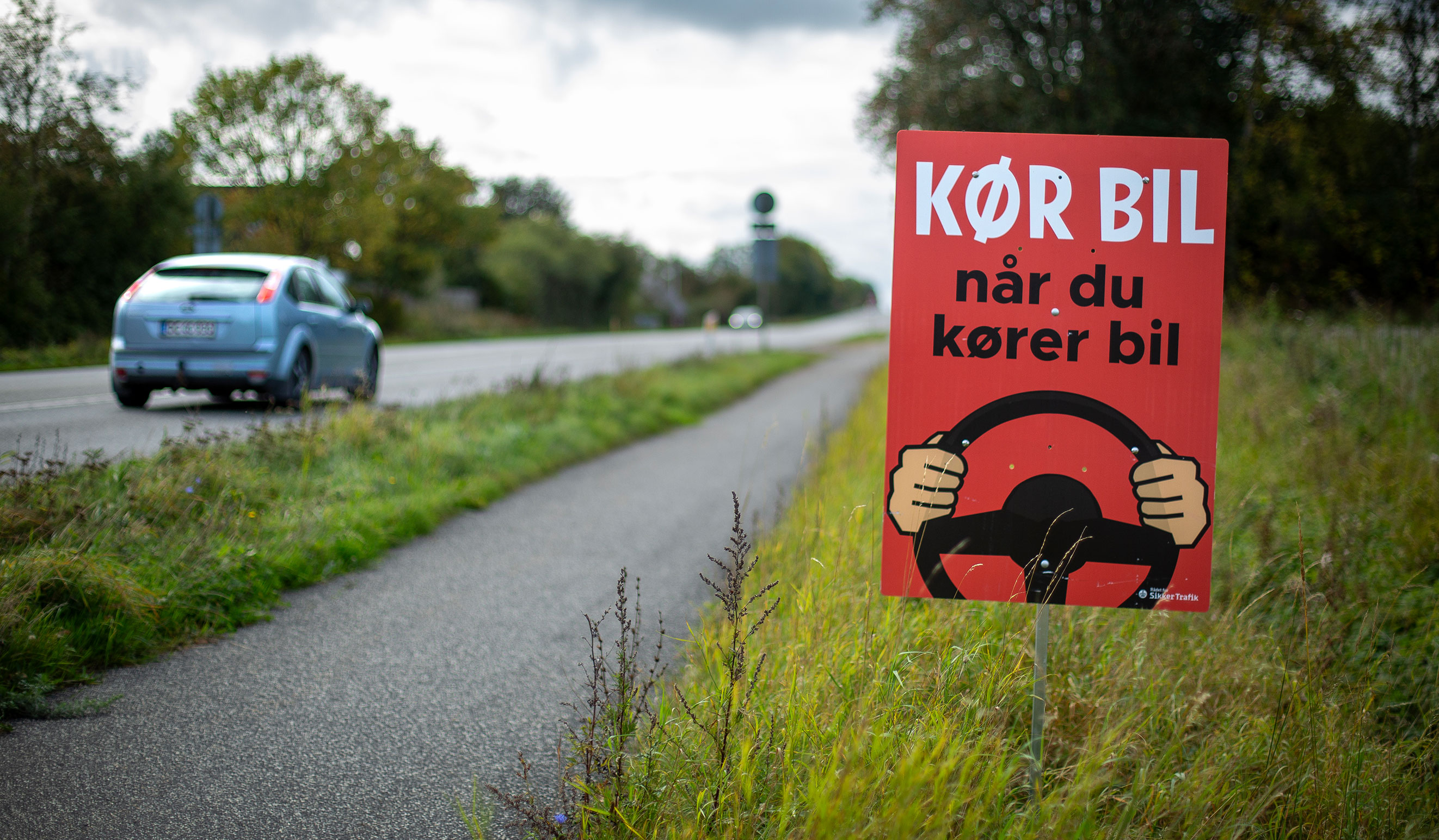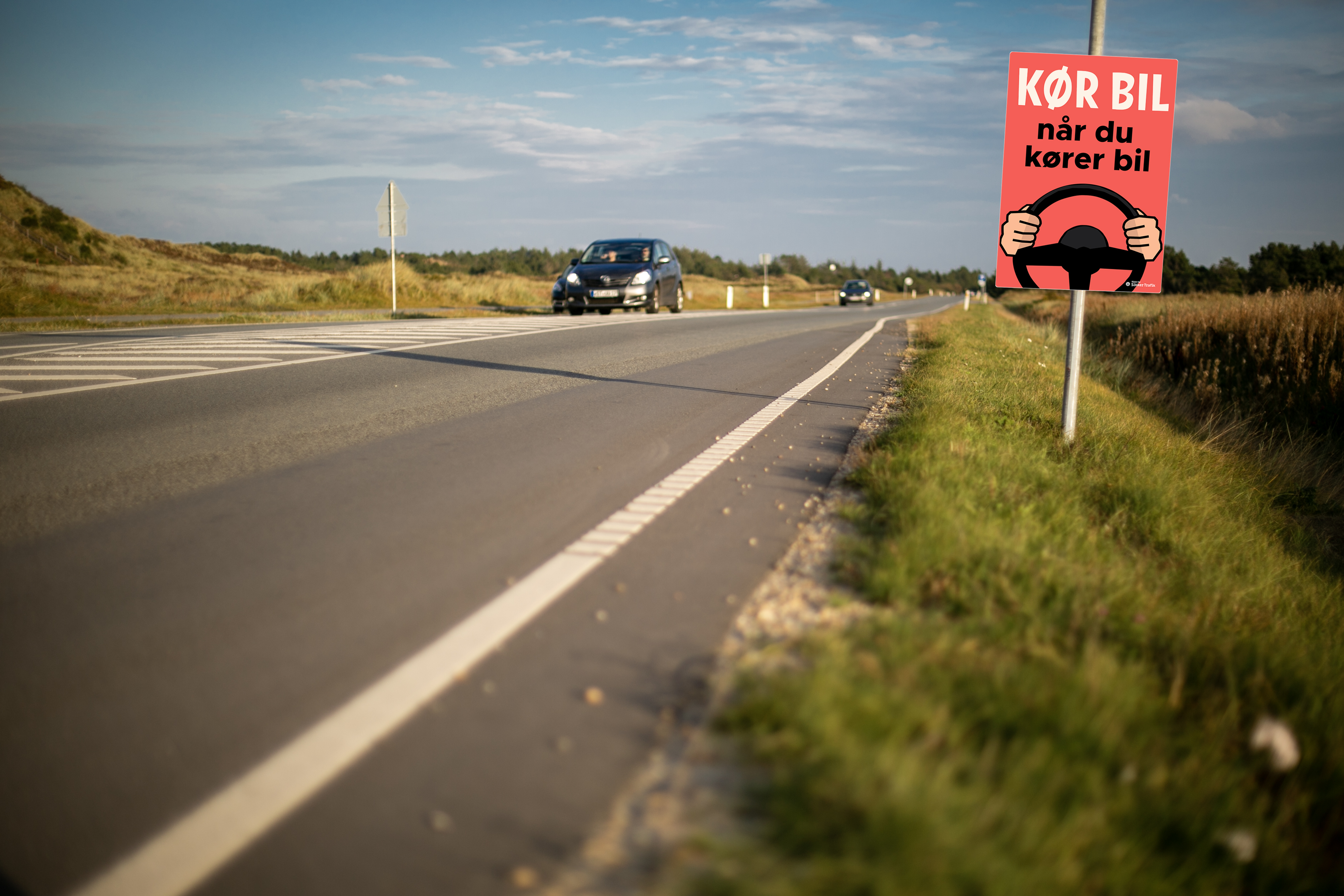 I de kommende uger vil bilisterne i Randers Kommune møde knaldrøde plakater på udvalgte steder. Plakaterne skal blandt andet få flere til at kigge op fra telefonen og holde øje med trafikken.