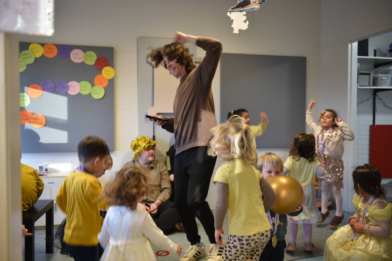 Bordet var dækket med en gulddug. Rundt omkring hængte guldpynt, børnene selv havde lavet op til guldfesten. Og flere af børnene var også selv trukket i gyldne outfits. Så der var lagt op til årets nok festligste frokost.