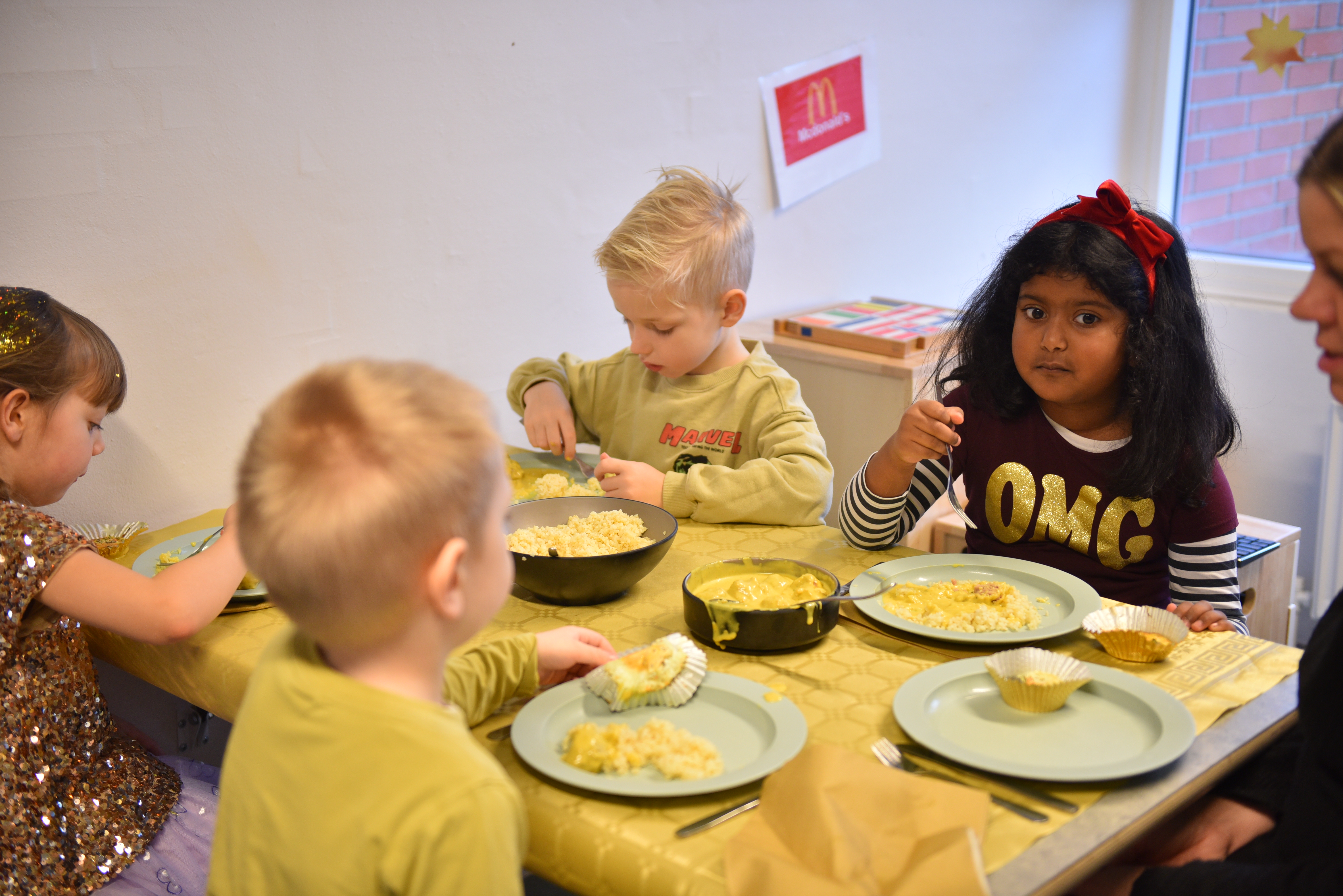 Bordet var dækket med en gulddug. Rundt omkring hængte guldpynt, børnene selv havde lavet op til guldfesten. Og flere af børnene var også selv trukket i gyldne outfits. Så der var lagt op til årets nok festligste frokost.
