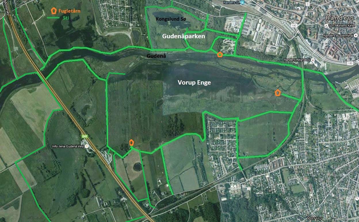 Du kan komme til Gudenåparken fra Hvidemøllevej, vandre via Trækstien fra Fladbro eller via stien fra Randers Regnskov.