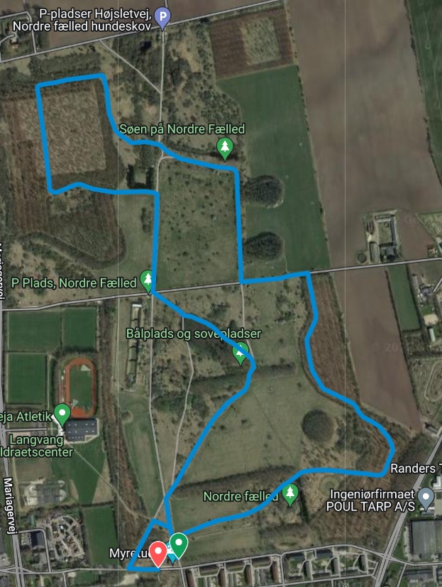 En god og anbefalelsesværdig rute til gå - og løbeture starter ved Myretuen ved Nordre Fælled, Gl. Fælledvej 1, 8930 Randers NØ. Der er en smule af ruten, som er på asfalt, men ellers er det mest gode naturstier.