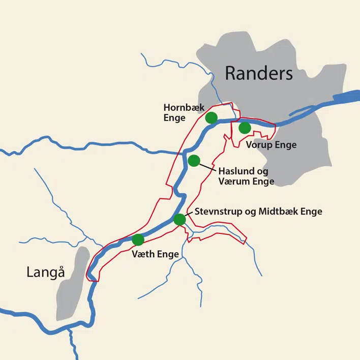 Gudenå-engene vest for Randers er i dag en naturpark med et rigt fugleliv og gode muligheder for at fiske i åen.
