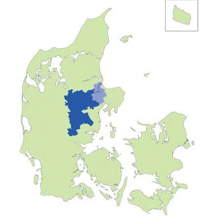 Gudenåen i sig selv afvander 2.600 km2 landområde (mørk blå farve)