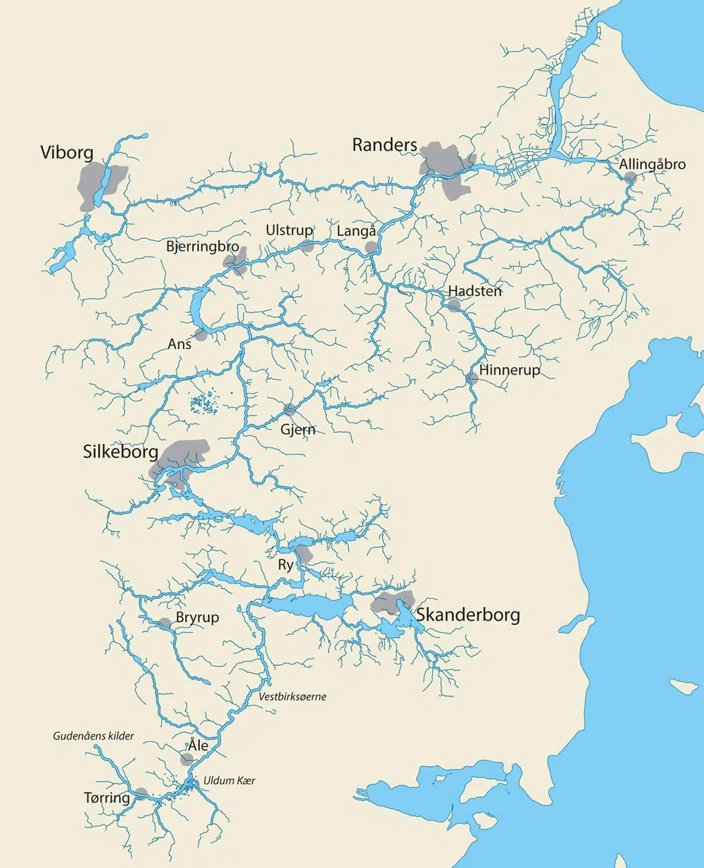 Gudenåens afvandingssystem – eller opland – er som et kæmpestort aflangt vandfad.