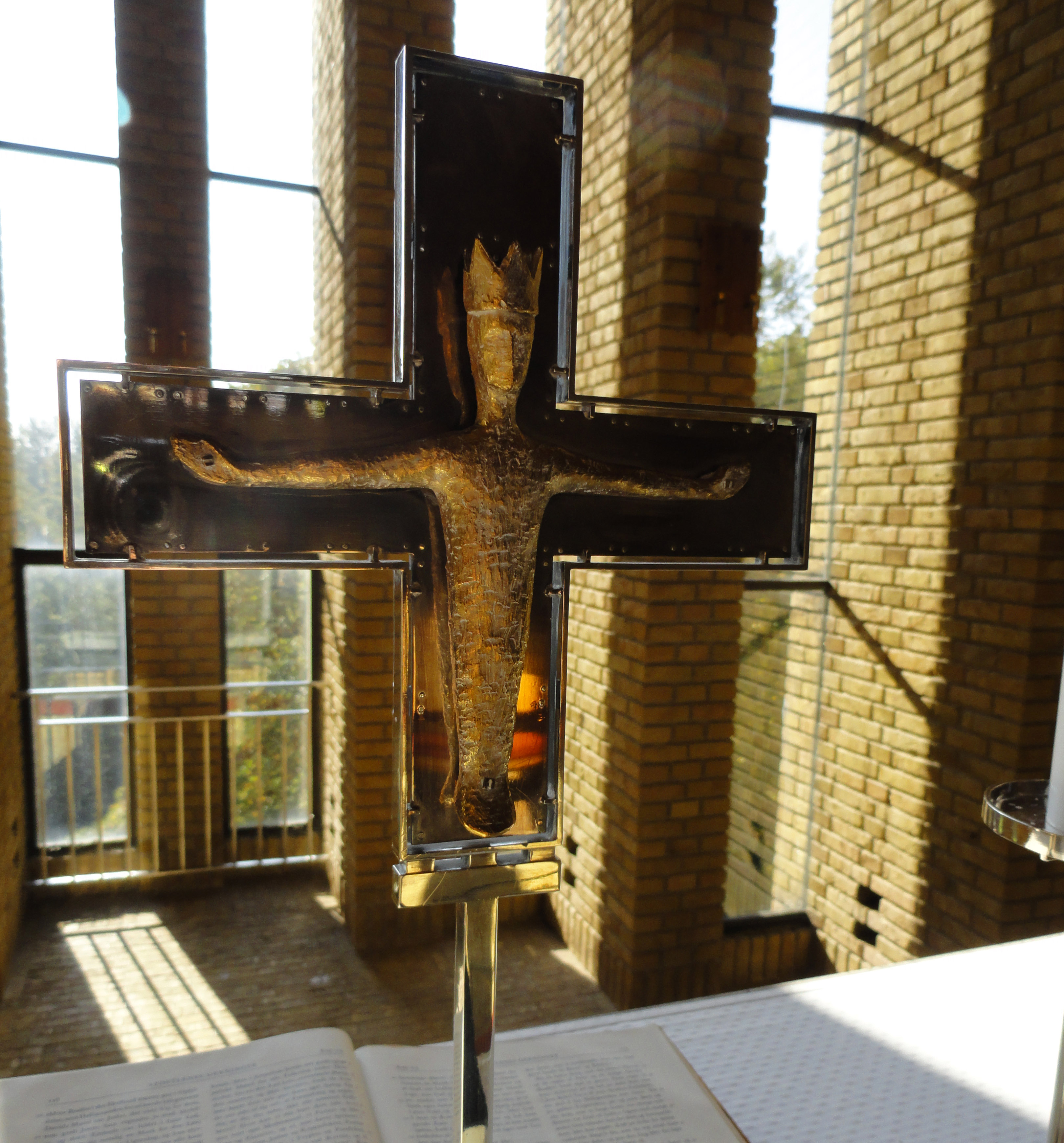 - Korset på alteret er lavet af guldsmedeparret Helga og Bent Exner.