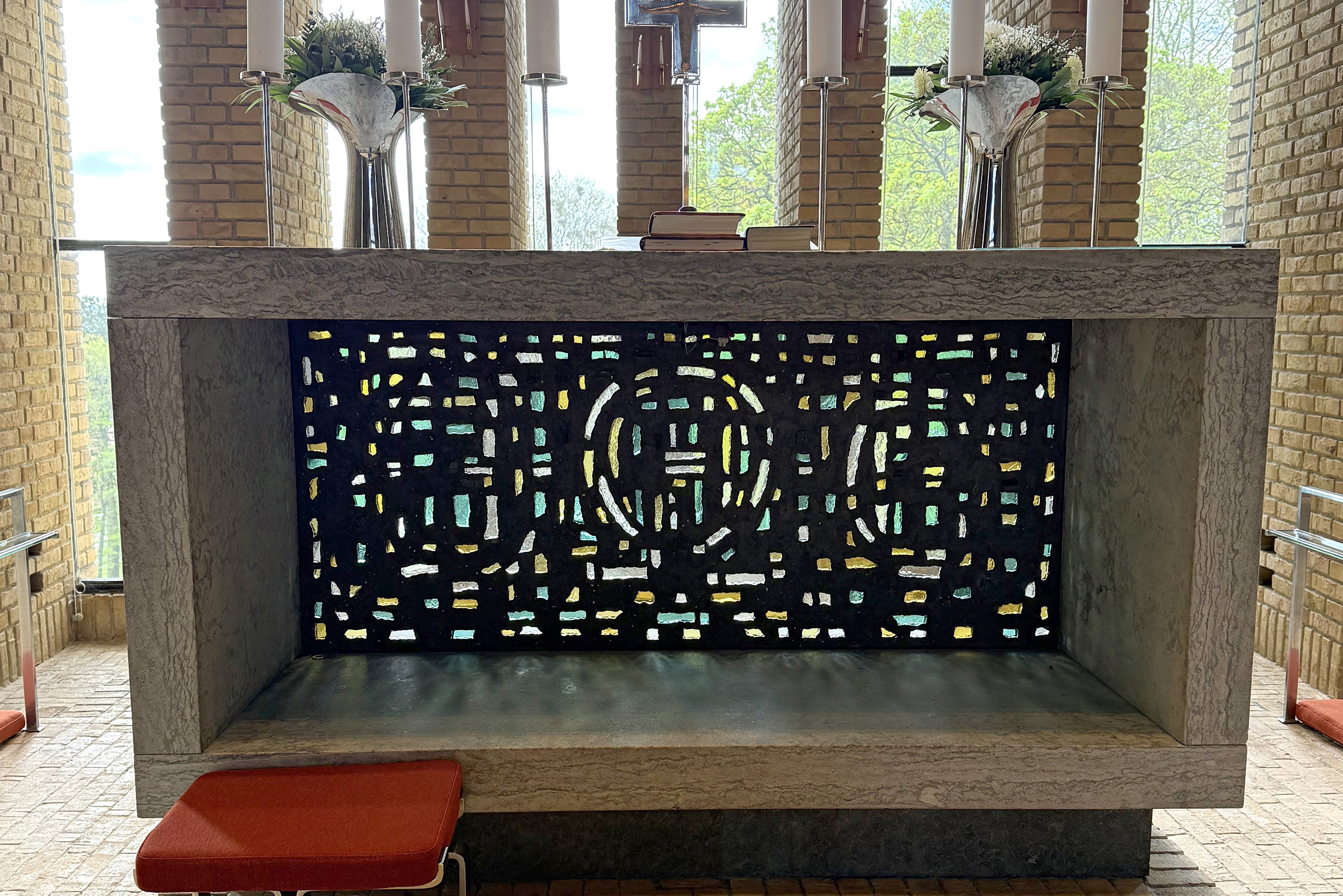 Glasmosaikken i centrum af alteret er fra 1969 og er lavet af Knud Lollegård.