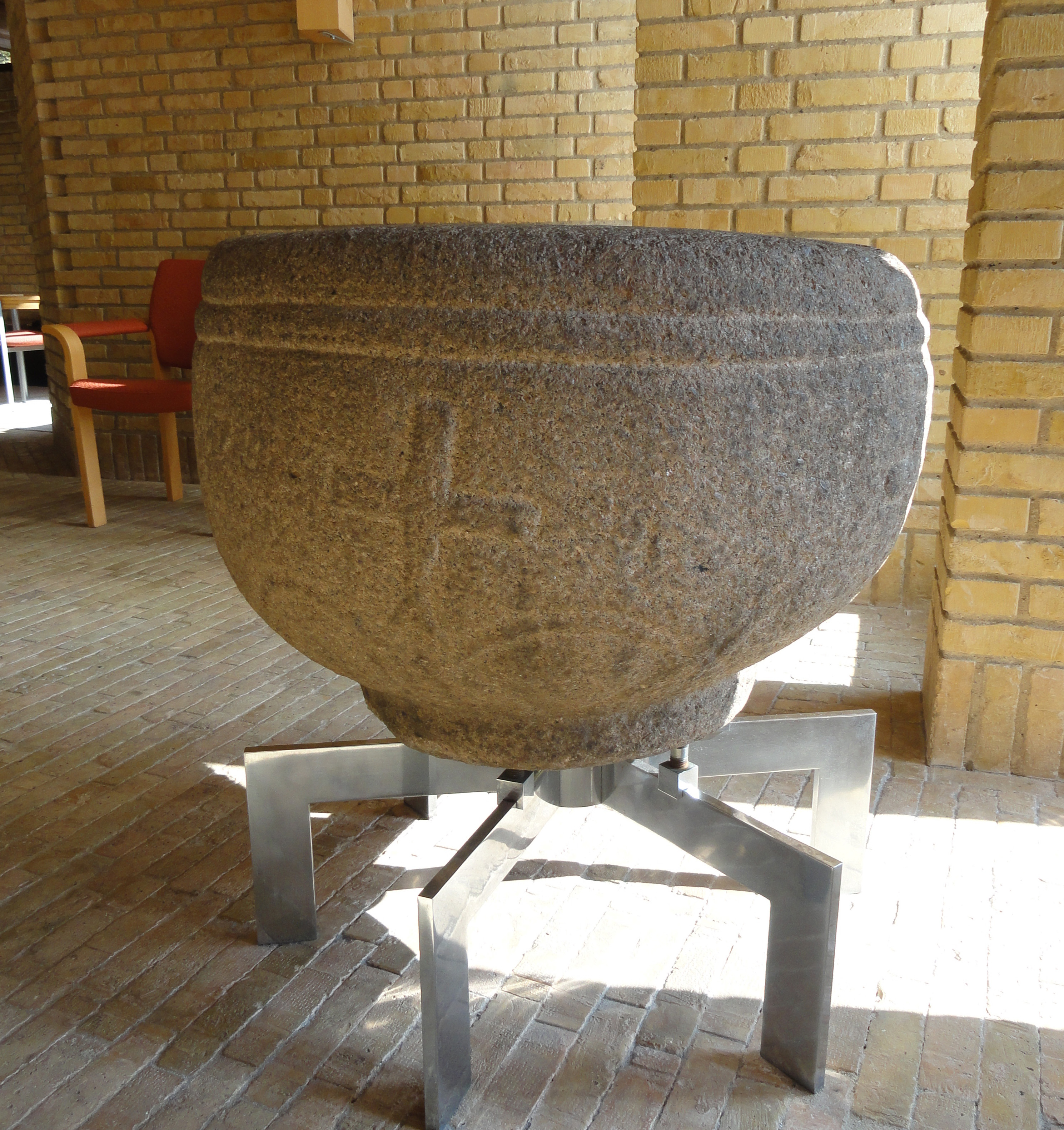 Den er hugget ud af granit med kors som udsmykning. Foden manglede, så den står nu med en stålkonstruktion som fod. Der er ikke noget dåbsfad. Vandet til dåb hældes op i selve kummen, som man gjorde før reformationen.