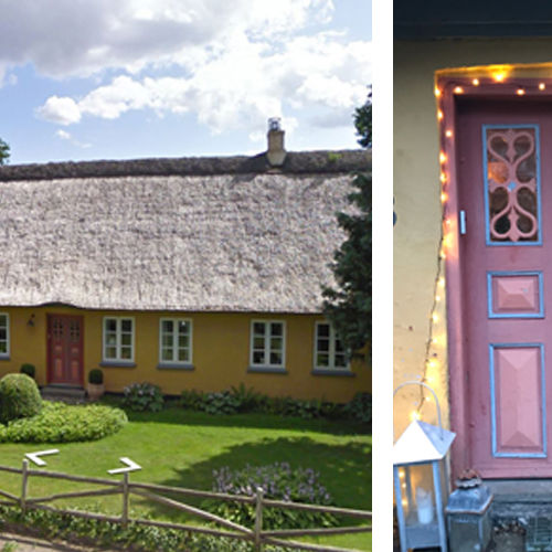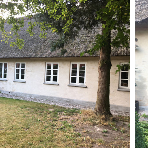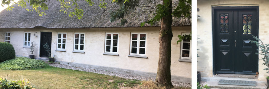 Den gule plastiske maling er erstattet af en diffusionsåben mørtel, så huset igen kan ånde. Fordør er nænsomt restaureret, så det kun er rådne dele der er udskiftet.