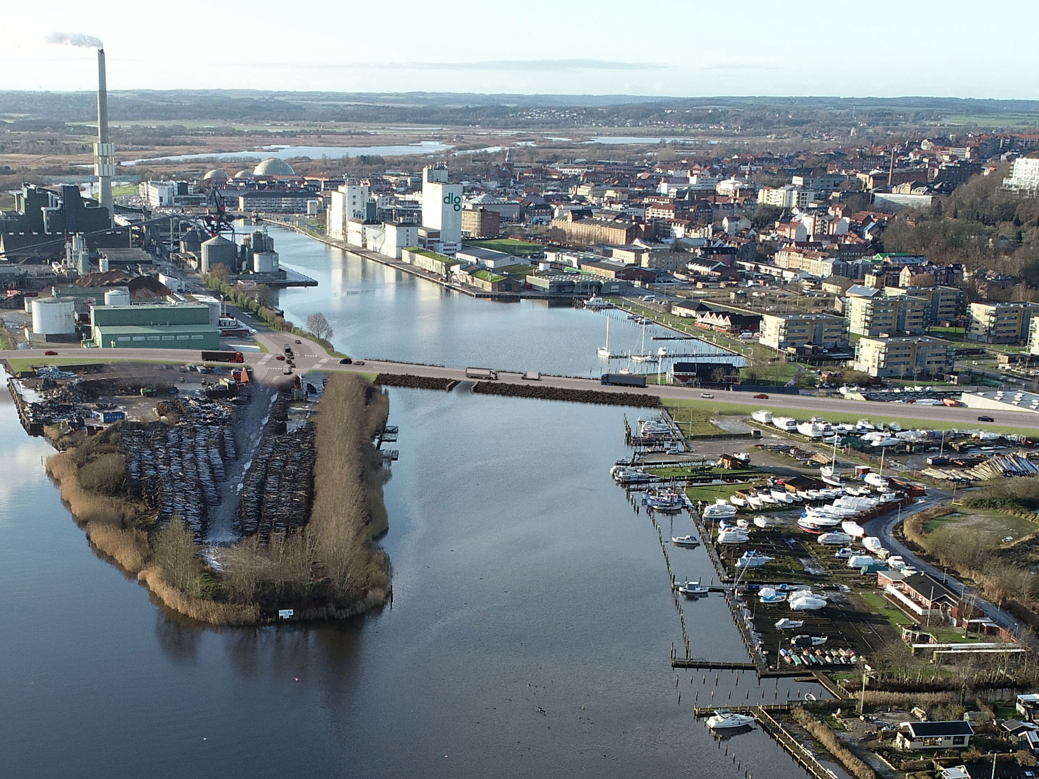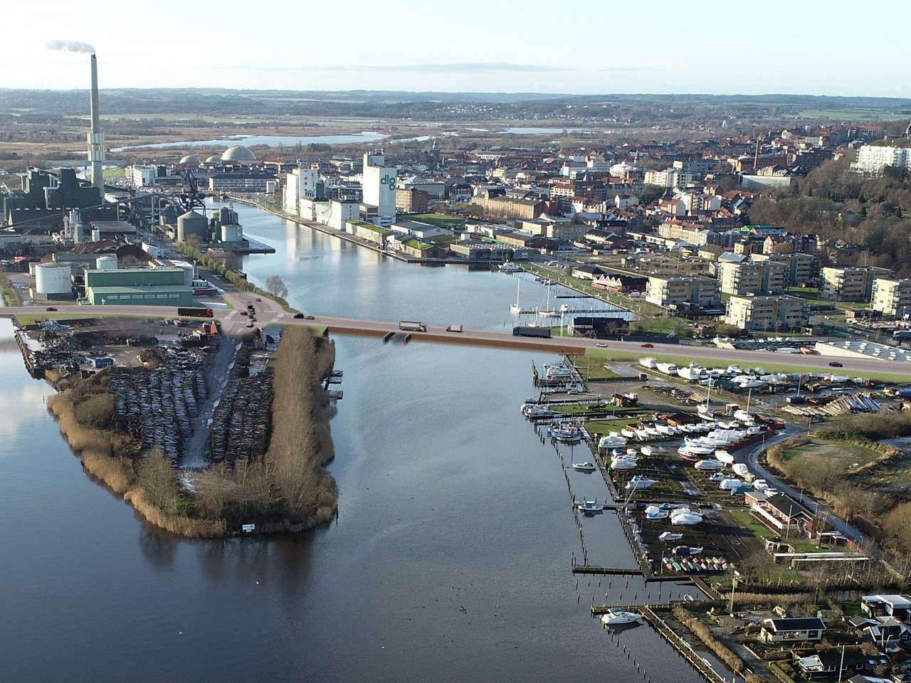 Dæmningen over det nordlige havnebassin bliver 160 meter lang. I dæmningen indbygges en sluse, der i størstedelen af tiden vil være åben for kano- og kajaksejlere og mindre fartøjer. I tilfælde af højvande kan slusen lukkes, så byen beskyttes. Regnvand fra byen løber ud i havnebassinet. Når vandstanden i fjorden er faldet, åbnes slusen og regnvand kan løbe ud i fjorden.